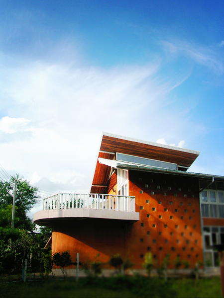 One interesting answer to this question can be had by getting to know a piece of architecture located at the edge of Nakhon Ratchasima province. This orange –mass earth shelter can be found out of the city. The house is topped with a lean-to shape roof that is outstandingly superimposing, making the house greatly distinctive after the city’s urban environment.
