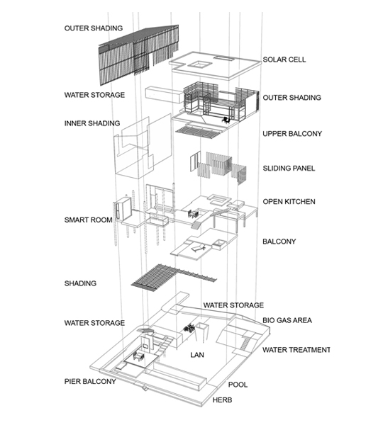 The functions of the house are provided for a living space, indoor and outdoor dining spaces, and services on the first floor. The second floor contains a space of working, music and library spaces, and bedrooms.