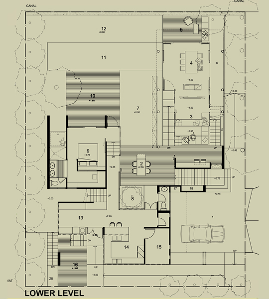 Environment is also an important point for this project, because the site is surrounded by a cannel, an old community, and orchard. Because of the good environment, the green court was created to like in the visual way and also make the green atmosphere for the house.