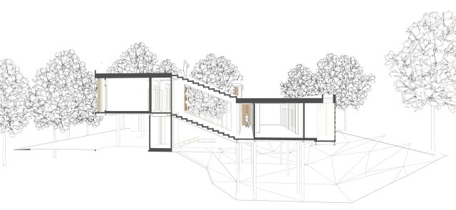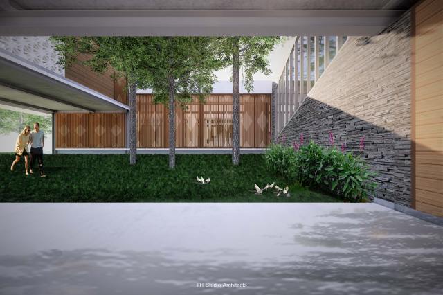 Some areas in suburban context express an environmental characteristic of the flooded landscape; TH Studio Architects designed the house as five slabs floating above the ground. The slabs are rectangular in shape between the upper and lower floors. The space between each level creates a diversity of spaces indoors and outdoors. Each slab is extended toward the green spaces, cantilevering in multiple directions as a terrace or outdoor space, and a heart of space is an open well of an inner courtyard opening to all privacy spaces, and a roof to cover an outdoor staircase. The roof slabs are also connected to all outdoor spaces, including the rooftop, by a secret staircase free from the ground level. In other words, all circulation is continuous using the outdoor space without cutting through the indoor.