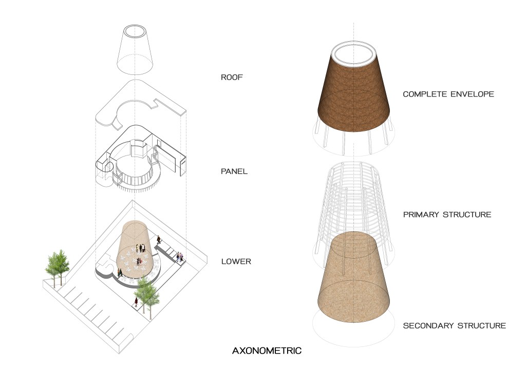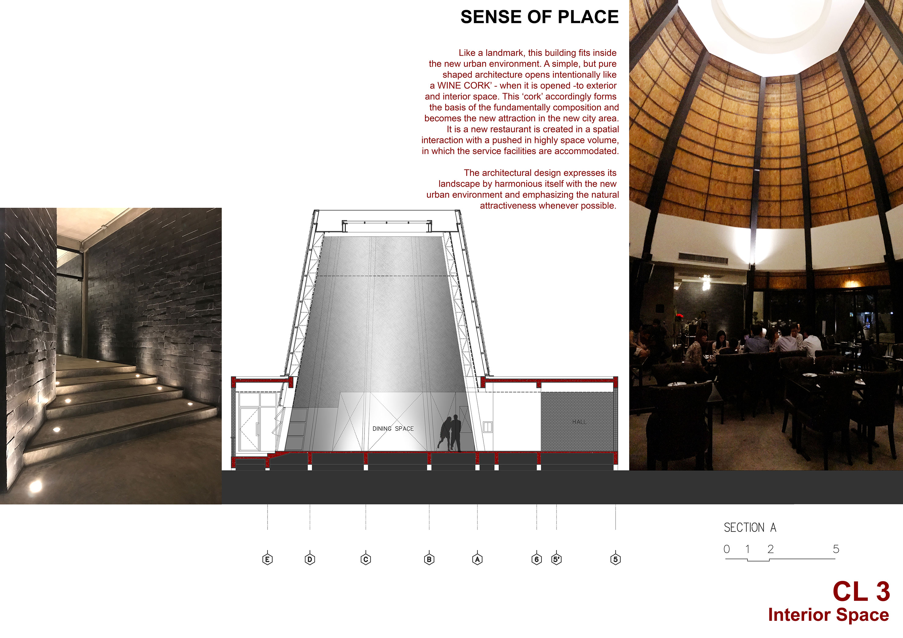 A simple, and pure form of architecture opens to intentional character like a WINE CORK. It is the basic form which is noticeable for remembering and becoming a new sense of attraction in the city. It is a new restaurant is created in a spatial interaction with a pushed in highly space volume, in which the service facilities are accommodated.