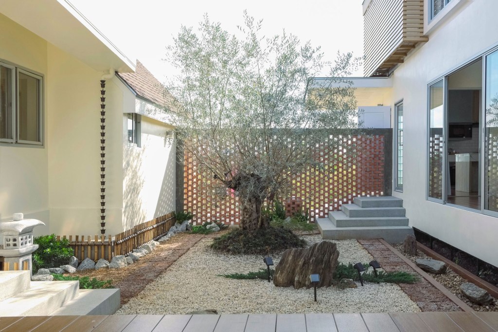 The interior is divided into two connected wings by a central courtyard, offering a tranquil outdoor space for relaxation. The eastern wing houses the parents’ and daughter’s bedrooms. It has a shared living area that opens onto the east pond. This creates a refreshing and inviting atmosphere. This space serves as the heart of the home, perfect for family gatherings.