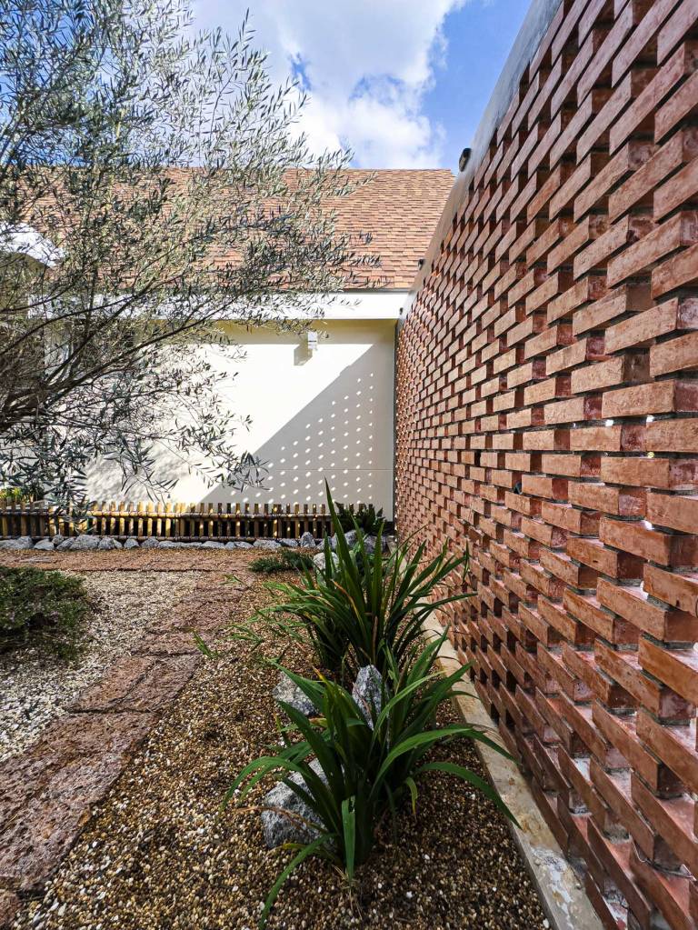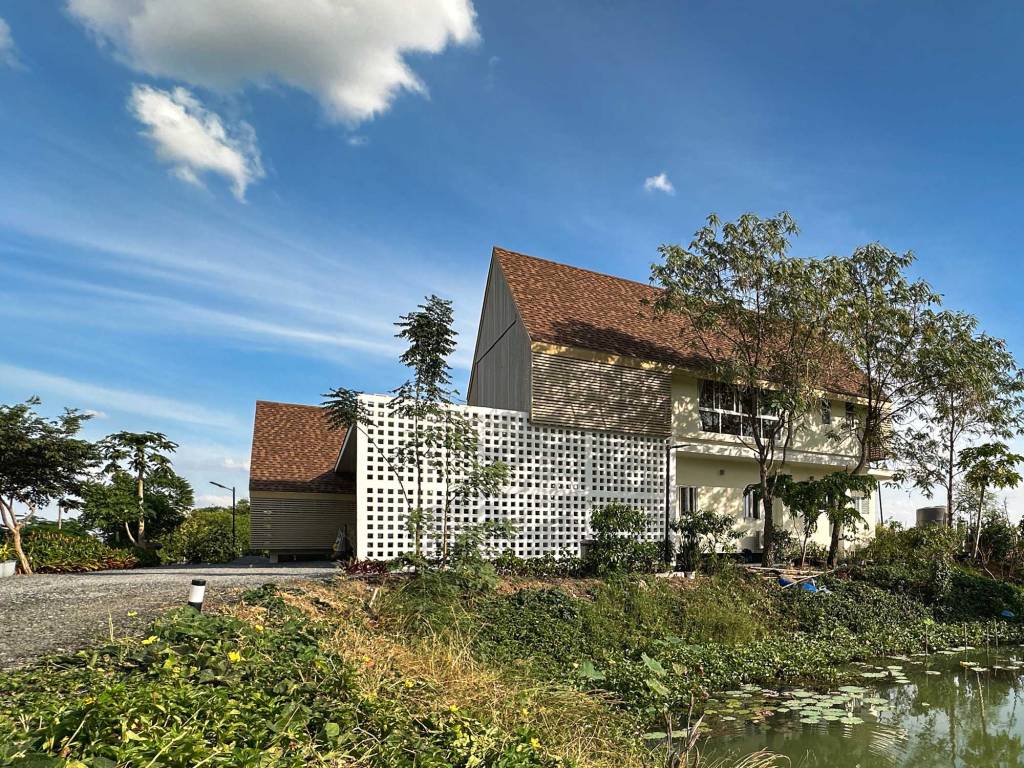 Situated midst a serene farm landscape, the house is oriented to maximize natural light and ventilation. The expansive ponds on the east and west sides add to the property’s idyllic charm. They also influence the house’s design. Latticework screens on the west facade mitigate the harsh afternoon sun and offer privacy, while allowing cooling breezes to circulate.