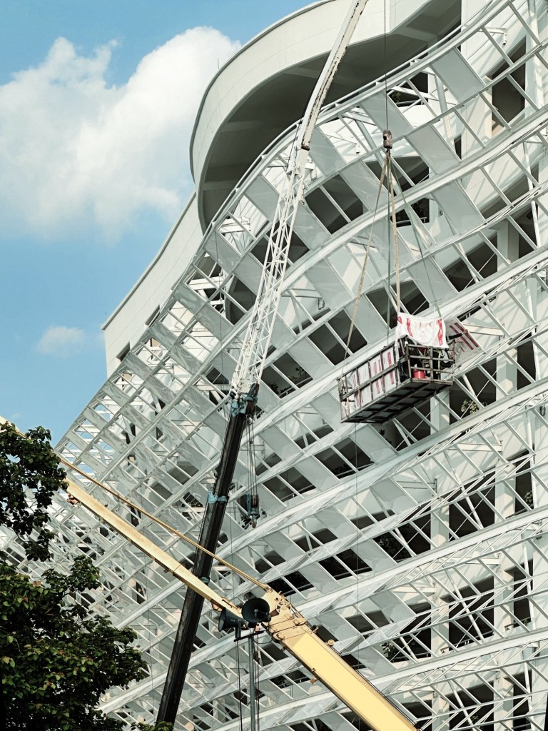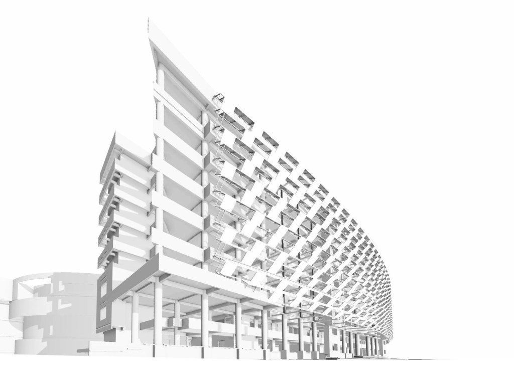 The key decision consisted of concentrating all the available spaces into the apartments themselves, by make the solid-faced continuous lines connect to the solid walls, and each floors to create a back and forth folding figure on the end of the building. It characterized by the concept.