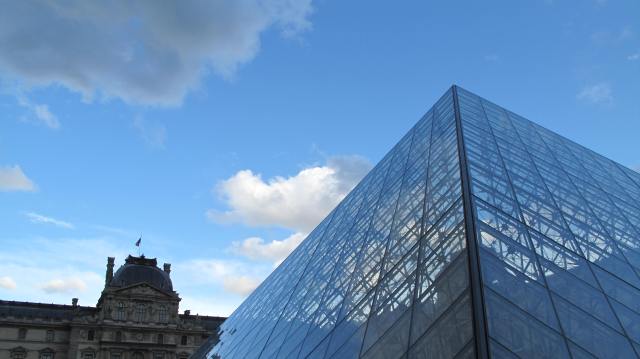 บรรยากาศยามเย็นของเมืองปารีส ประเทศฝรั่งเศส กับภาพเบื้องหน้าของพิพิธภัณฑ์ The Louvre Museum บริเวณ the main pyramid ซึ่งเป็นทางเข้าหลัก และ pyramid รองที่มีอยู่สามจุดเป็นองค์ประกอบหลักที่ทำหน้าเป็นโถงย่อย ที่แสดงถึงสิ่งที่เรารับรู้ถึง Movement of Controversy อย่างชัดเจน