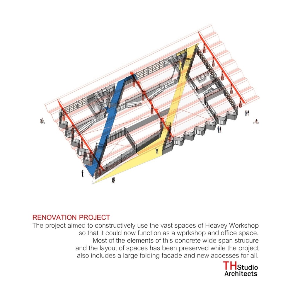 The project aimed to constructively use the vast spaces of Heavy Workshop so that it now works as a workshop and office space.
