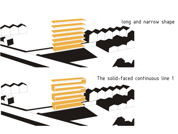 The key decision consisted of concentrating all the available spaces into the apartments themselves, by make the solid-faced continuous lines connect to the solid walls, and each floors to create a back and forth folding figure on the end of the building. It characterized by the concept.