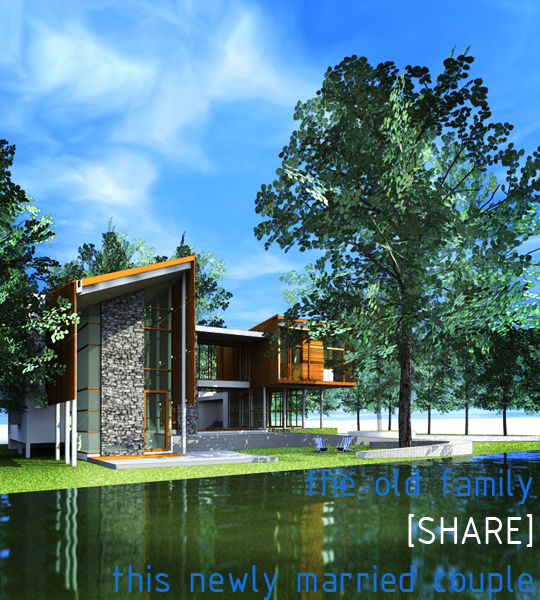 The concept of the house brought about the old and new situations of family members who will live at this house. The ‘old’ situation is parents and the ‘new’ means a just married couple. They will share on the spaces of the new house. The house is interpreted and called ‘SHARE HOUSE’.
